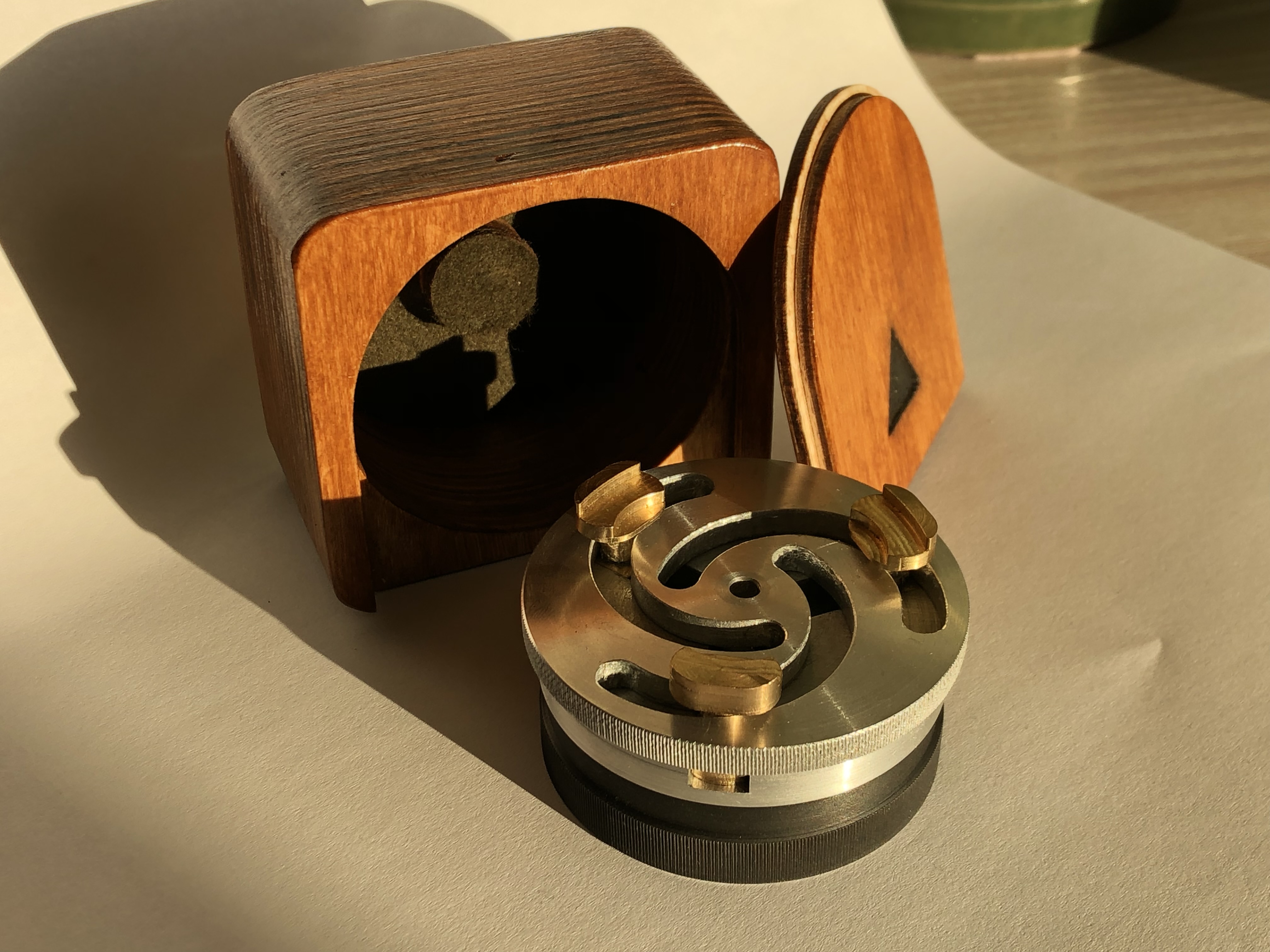 Watch caliber chuck machined as a gift for a friend watchmaker. The scroll-type chuck holds watch movements securely during service and assembly. Designed in CAD and machined on the CNC router and a manual lathe.
